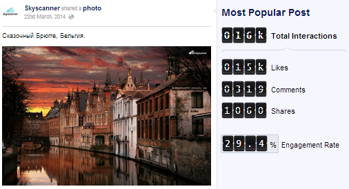 Самой популярной в марте публикацией на Facebook стала фотография со страницы компании Skyscanner, которая занимается поиском дешевых авиабилетов. Она набрала 15 000 лайков, 319 комментариев и 1060 расшариваний.