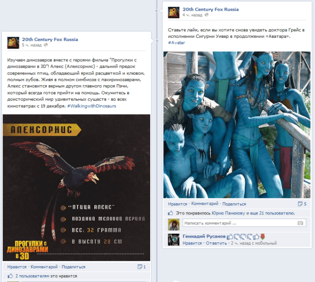 Александр: основной контент официальных страниц Двадцатый Век Фокс СНГ - анонсы фильмов. Перед нами не стоит задачи специально делать контент привлекательным для пользователей, т.к. в большинстве случаев он им интересен заранее. Но есть и свои особенности - важно, чтобы контент не надоедал. Поэтому, помимо тизеров кинофильмов, публикуются разные новости, информация о сьемках, фото и т.д. Самое главное – такая информация должна быть интересна целевой аудитории.