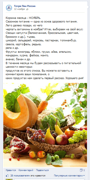 Основная аудитория сообщества – женщины, поэтому контент в первую очередь ориентирован на них. Основные темы – здоровый образ жизни, правильное питание, тренды в спорте, йога и т.д., в которые органично вписан бренд. Кроме того, проводятся конкурсы. Есть постоянная рубрика «Корзина месяца», в которой пользователям рассказывается, на какие продукты стоит обратить внимание именно сейчас.