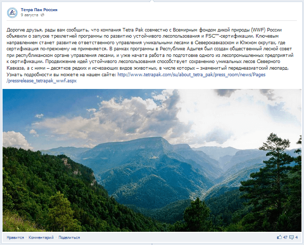 Екатерина Волкова: мы часто пишем об экологической ориентированности нашей компании. Однако серия публикаций о важности сохранения леса вызвала негативную реакцию со стороны аудитории – т.к. Тетра Пак использует древесину для производства. Нам пришлось пересмотреть стратегию – мы стали писать не просто о лесе, а о том, что делает именно наша компания для его сохранения.