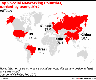 По ожиданиям eMarketer, количество пользователей социальных сетей в Рунете в 2012 г. достигнет отметки в 57,9 млн. Соответственно, Россия должна будет выйти на 5 место в мире по размеру аудитории соцмедиа.