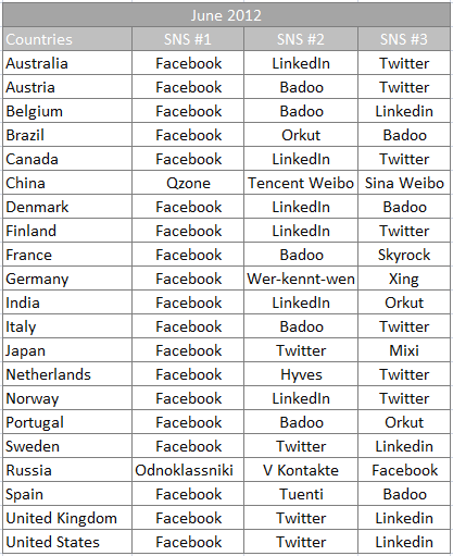 Добавим, что количество пользователей в стоциальных сетях в России и в мире отслеживает не только eMarketer. Итальянский social media-стратег Винченцо Козенца (Vincenzo Cosenza) на основе данных Google Trends for Websites / Alexa создал карту глобального распространения соцсетей в июне 2012 г. Согласно ей, Facebook является социальной сетью №1 в 126 из 137 проанализированных стран. В России роль лидера по объёму трафика принадлежит Одноклассникам, в Китае – QZone, во Вьетнаме – Zing, в Латвии – Draugiem.