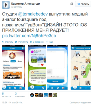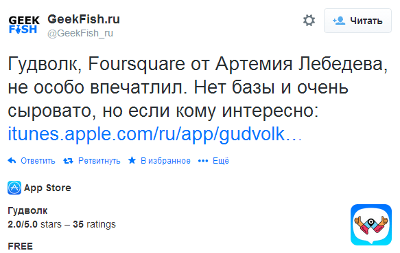 Студия Артемия Лебедева выпустила геолокационное приложение GoodWalk, которое уже назвали аналогом Foursquare. Как и в западной соцсети, пользователи Гудволк могут чекиниться, оставлять отзывы о разных заведениях и писать сообщения, привязывая их к определенной точке.