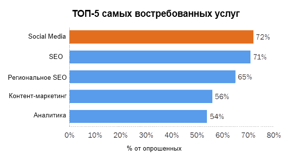 Самой востребованной услугой оказалось продвижение в социальных сетях. Почти 72% маркетологов сообщили о повышенном спросе на социальные медиа. Чуть менее популярна оказалась поисковая оптимизация – 71%.