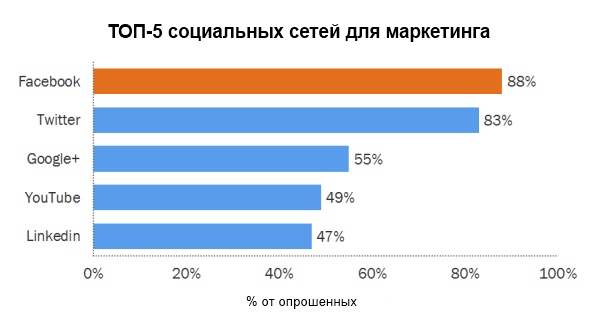 Наиболее популярными социальными платформами у маркетологов оказались Facebook (88%) и Twitter (83%). На третье место неожиданно попал Google+. Оказалось, что более половины маркетологов создают бизнес-страницы в этой забытой пользователями социальной сети. Хотя, есть вероятность, что мы в далекой России чего-то не знаем о социальной сети интернет-гиганта. Другого способа объяснить феномен Google+ не представляется возможным.