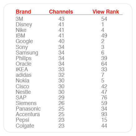 Количество каналов не является ключом к успеху, т.к. view rank (позиция компании, согласно количеству просмотров видео) брендов с наибольшим количеством каналов меньше, чем у других.