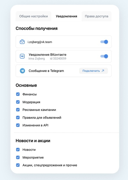 Чтобы подключить уведомления, необходимо зайти в рекламный кабинет VK Рекламы в раздел «Настройки» → «Уведомления». При подключении коммуникации в Telegram пользователь попадет в чат-бот.
