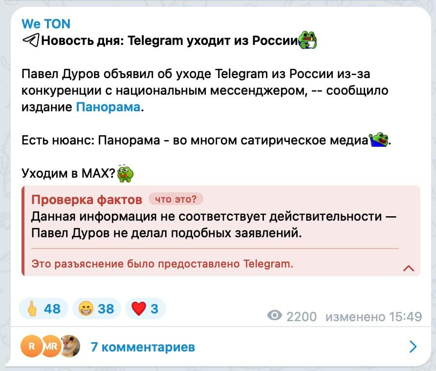 В Telegram появилась функция проверки фактов на достоверность. Плашка «Проверка фактов» (Fact Check) была замечена под постом в канале WE TON. Там опубликовали пост о том, что мессенджер уходит из России. Внизу под постом появился блок, оформленный под цитату – в нем говорится, что основатель Telegram Павел Дуров не делал подобных заявлений.