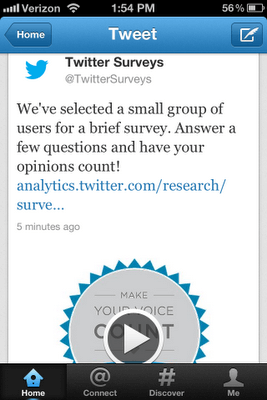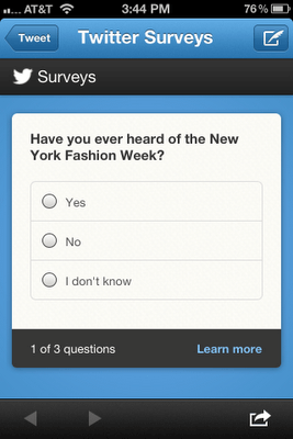 Twitter тестирует новый рекламный инструмент – Опросы (Twitter Surveys). Совместная разработка Twitter и Nielsen поможет рекламодателям измерять влияние бренда в Twitter-среде: получить больше информации об узнаваемости бренда, маркетинговых метриках и настроениях пользователей купить тот или иной товар.