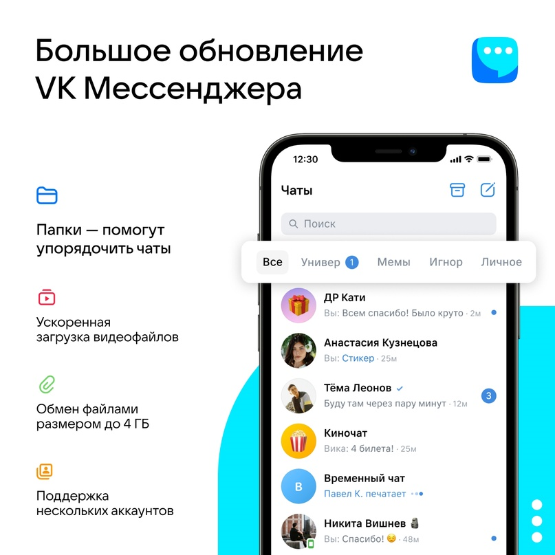 В приложении VK Мессенджер появилась возможность группировать чаты по папкам. Переписки можно распределить по разным тематикам и навести порядок в чатах. Добавить в папки можно не только чаты из ВКонтакте, но и переписки с контактами из телефонной книги.