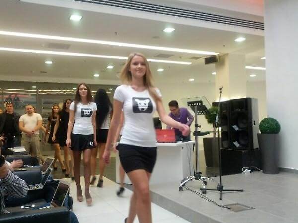 Видимо, чтобы собравшаяся аудитория (специалисты по SEO, интернет-маркетингу, заказчики SEO-услуг) лучше воспринимала доклад, на разогрев публики под музыку «Pretty Woman» были выпущены длинноногие девушки в футболках с символикой социальной сети ВКонтакте. Они прошлись перед аудиторией и встали вдоль стены.