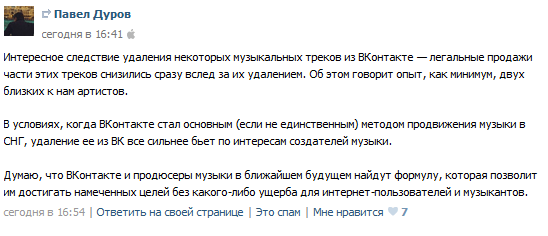 Но впечатлит ли такой опыт музыкальные лейблы – еще тот вопрос. Аргументы у них тоже присутствуют: пользователи невинные жертвы, распространение пиратского контента Вконтакте способствует уменьшению рынка, падает качество музыки, и в итоге страдает вся музыкальная индустрия. Именно об этом говорил Дмитрий Коннов, генеральный директор Universal Music Russia, несколько недель назад в программе Дзядко3 на телеканале Дождь.