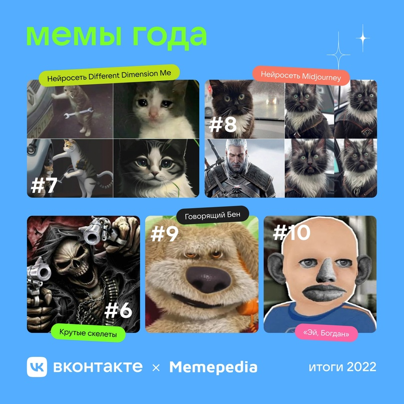 ВКонтакте вместе с онлайн-энциклопедией Memepedia объявила самые популярные мемы 2022 года. Выбирали мемы пользователи в мини-приложении «Годнометр».