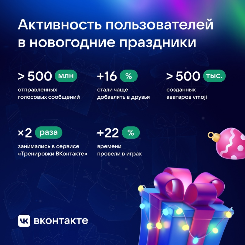 - Активно пользователи создавали персональные цифровые аватары – во время каникул vmoji стало на 500 тысяч больше. Теперь своими уникальными vmoji пользуются более 8,5 миллиона человек.