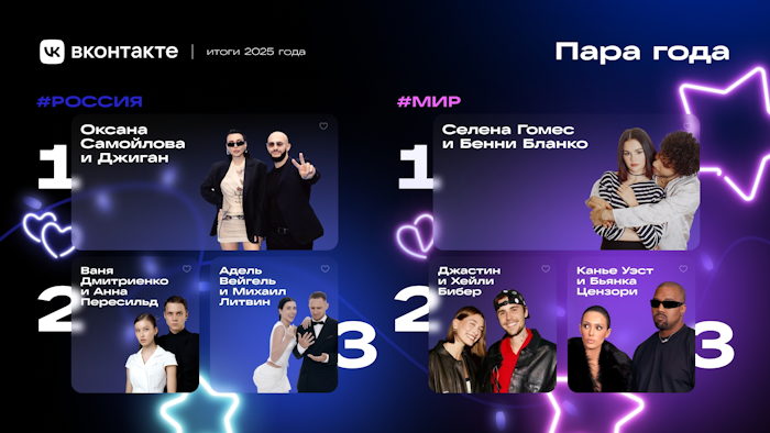 - В категории «Пары» чаще всего пользователи ВКонтакте говорили о разводе Джигана и Оксаны Самойловой. Второе место заняли Анна Пересильд и Ваня Дмитриенко. Пользователи обсуждали совместные выходы пары. На третьей строчке находятся Михаил Литвин и Адель Вейгель: их свадьбу называют одним из самых заметных событий года.