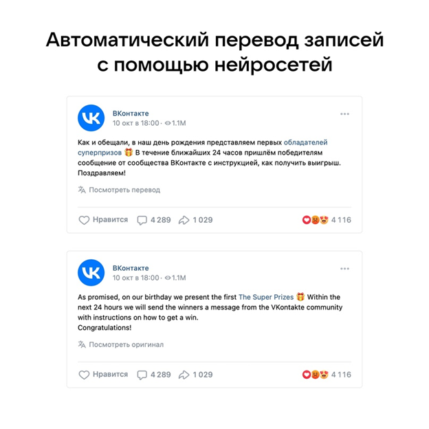 Нейросети ВКонтакте научились автоматически переводить размещенные в сообществах публикации с русского на английский язык. Новая функция поможет пользователям из разных стран знакомиться с уникальным русскоязычным контентом социальной сети. В свою очередь, авторы смогут рассказать о себе более широкой аудитории.