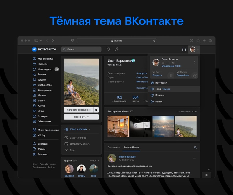 Функция будет полезна тем, кто пользуется ВКонтакте в условиях слабой освещенности. Переключить тему можно в меню за аватаром в верхнем правом углу. Кроме того, на первое время переключатель будет доступен на странице пользователя и в профилях его друзей.