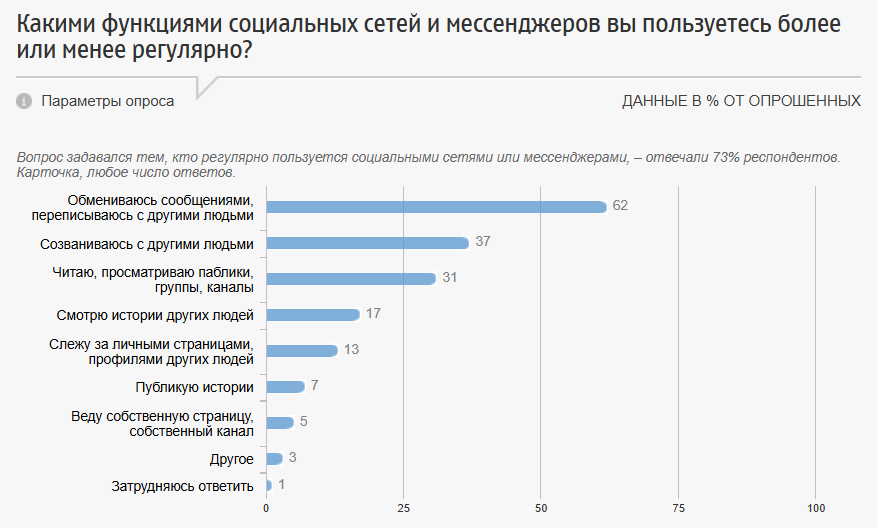 - Наиболее востребованные функции мессенджеров и социальных сетей у россиян – переписка (62%), звонки (37%) и просмотр контента в группах и каналах (31%).