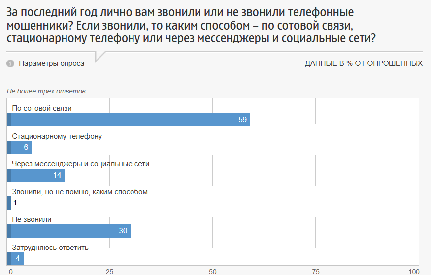 Также россияне ответили на вопрос, звонили или не звонили им мошенники за последний год и по каким каналам. 59% респондентов сообщили, что мошенники звонили им по сотовой связи, 14% – через мессенджеры и социальные сети.