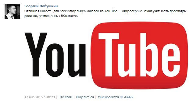 Глава пресс-службы ВКонтакте Георгий Лобушкин в минувшие выходные сообщил в социальных сетях о том, что YouTube снова начал начал учитывать просмотры роликов из ВКонтакте. Напомним, что начиная с 2012 года эта функция была упразднена по инициативе ВКонтакте, что вызвав недовольство многих видеоблогеров.