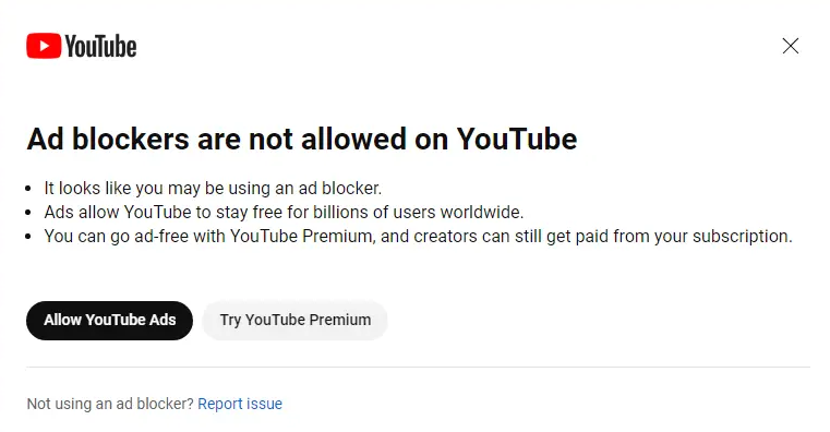 Люди, попавшие в тестирование, видят на экране предупреждение, что «блокировщики рекламы запрещены на YouTube». Затем они могу разрешить показ рекламы либо подключить платную подписку YouTube Premium, чтобы смотреть видео без промороликов.