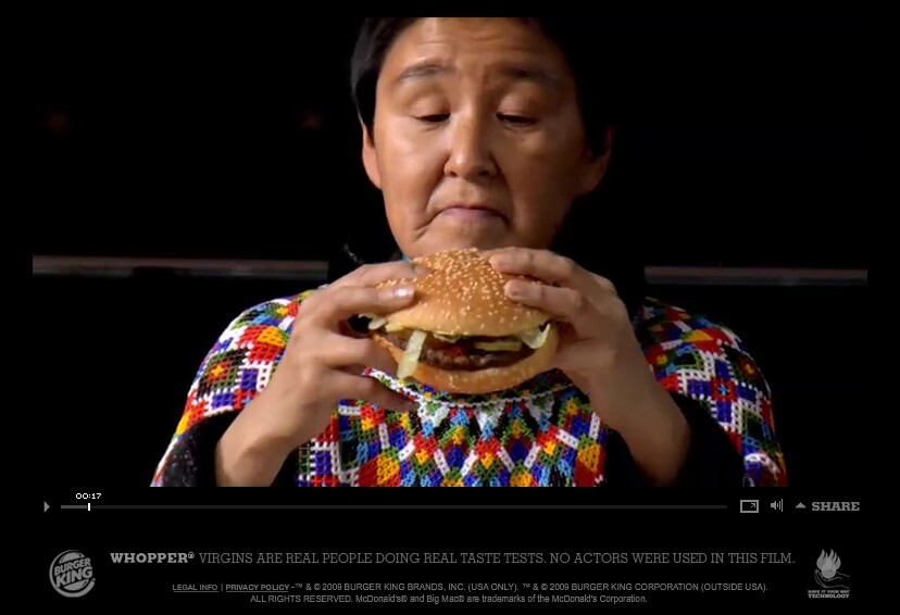 В 2008 году Burger King решили использовать новую технологию для продвижения своих гамбургеров Воппер (Whopper). В рамках акции они не только крутили рекламу по ТВ, но и создали сайт WhopperVirgins.com, который показывал видео с людьми, впервые дегустировавшими новые воппер-гамбургеры.