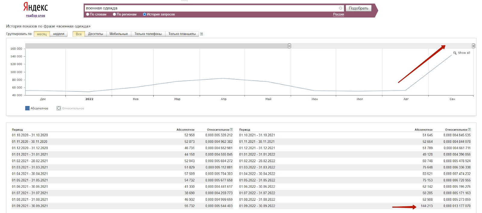 Количество показов за сентябрь по запросу «военная одежда» выросло в 2,7 раз по сравнению с прошлым месяцем